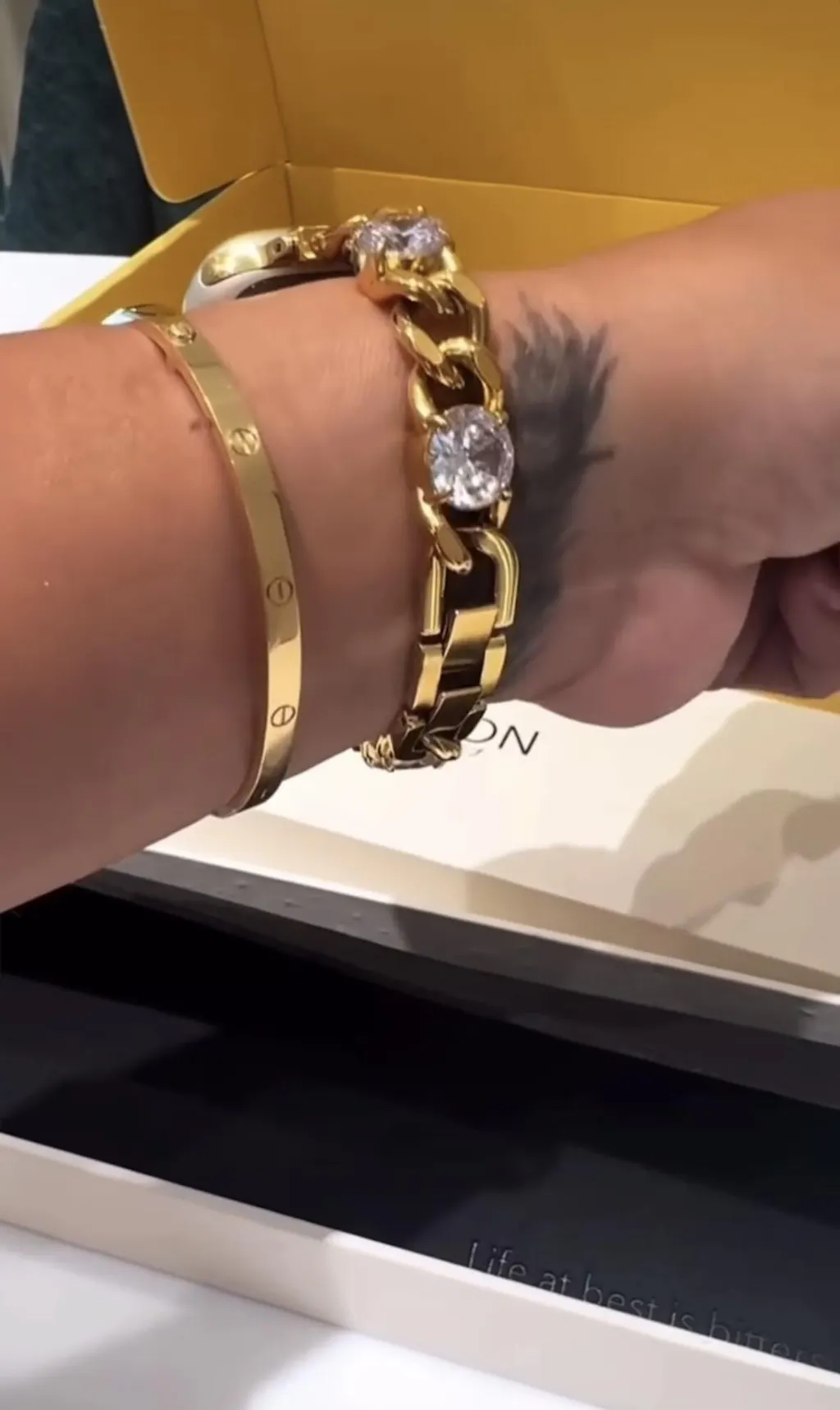 316ステンレス鋼と4つのジルコニアアクセントで作られたこのスリムな金色の防水ブレスレットは、耐久性とエレガンスを融合させています。