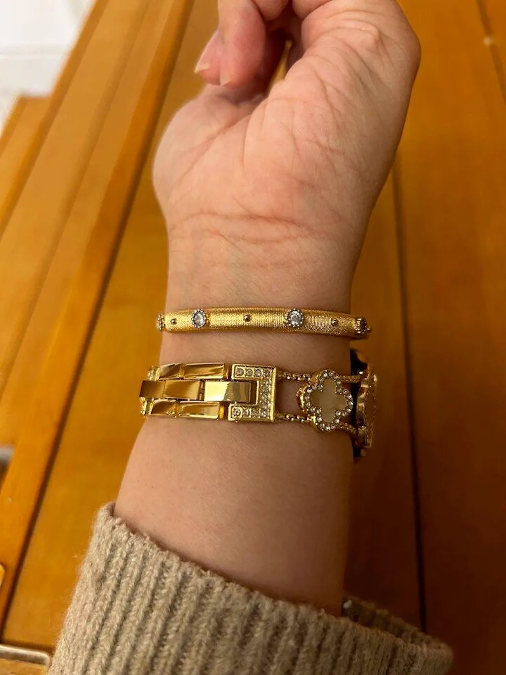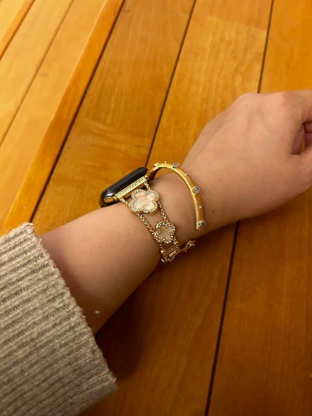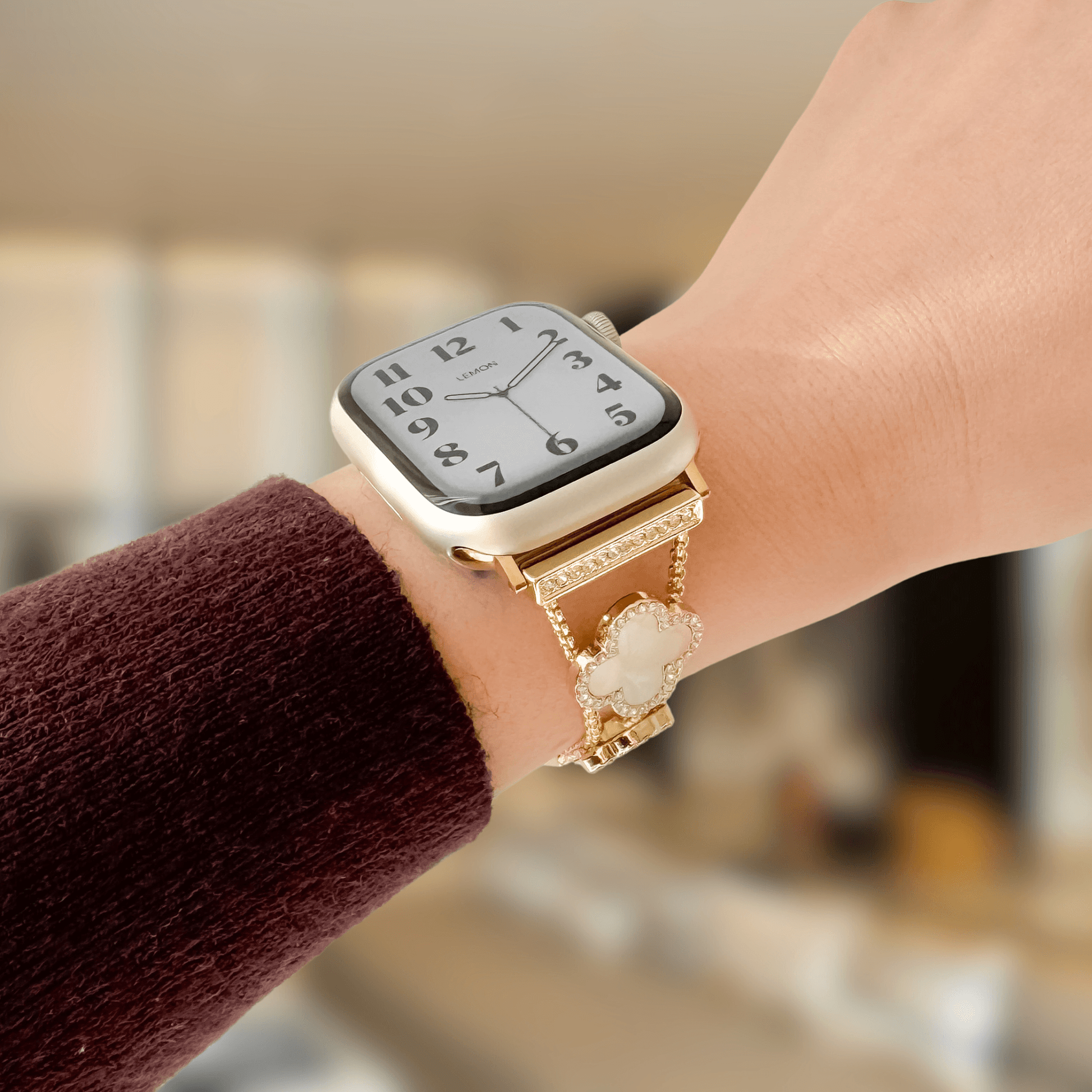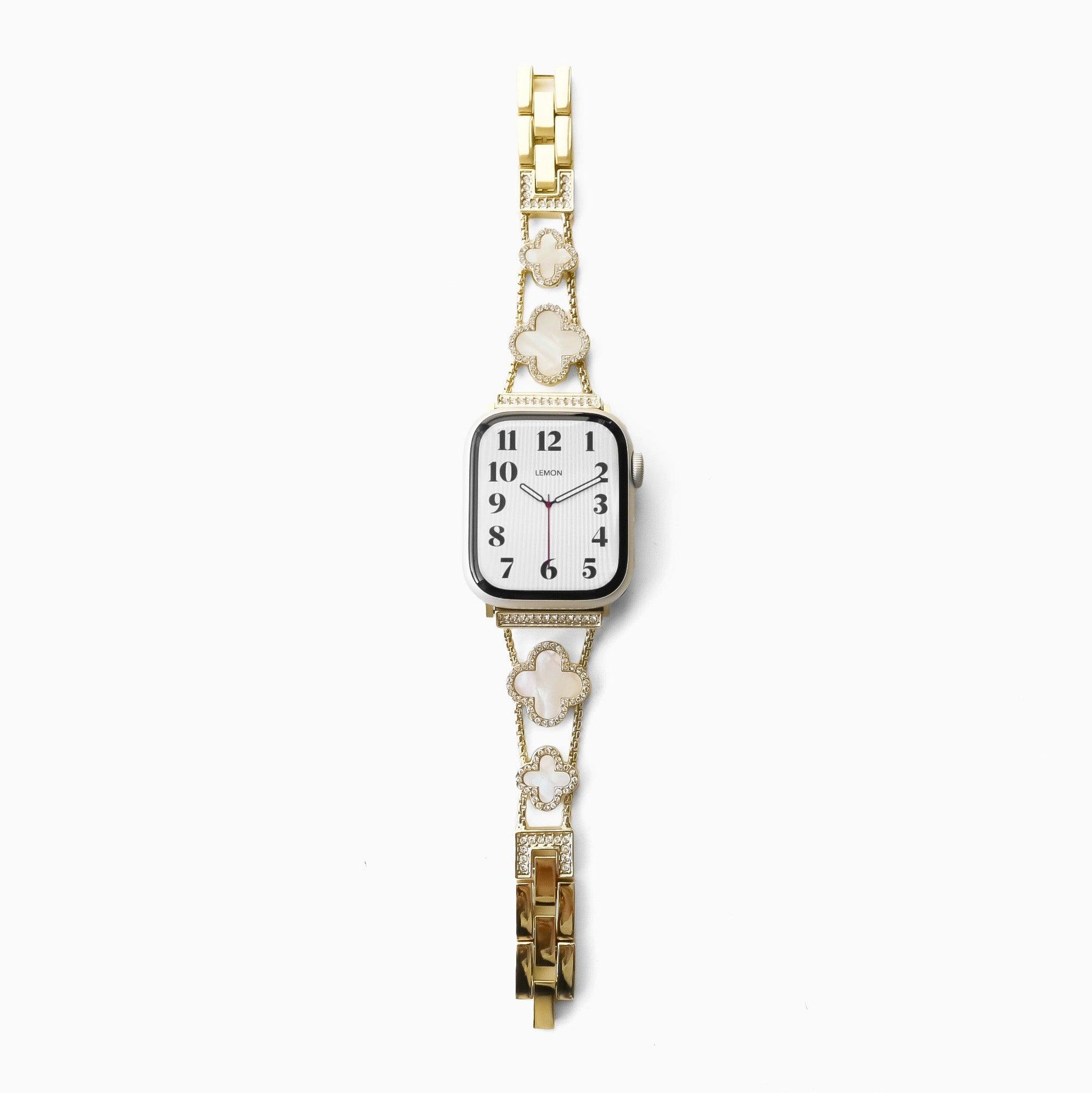 Embrace the charm of nature with this gold Apple Watch bracelet, where each clover detail not only adds elegance but also symbolizes luck and prosperity. The mother-of-pearl clovers are a nod to nature's promise of good fortune, making your timepiece not just a gadget, but a talisman of success and joy.