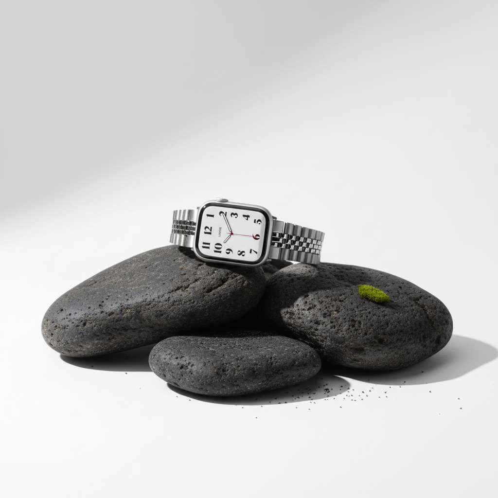 This five-piece stainless steel watch strap, featuring a refined brushed texture with polished accents, is designed for timeless durability. Water and sweat-resistant, it’s the perfect companion for everyday elegance.